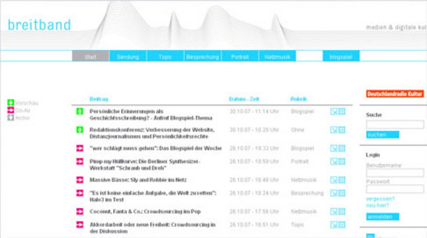 „Breitband ist auch ein Portal für neue Radioformen und akustische Experimente. Im Blogspiel haben User die Möglichkeit, Ihre Audiokommentare und Radiobeiträge hochzuladen und zur Diskussion zu stellen. Eine Redaktionsauswahl kürt die besten Beiträge, die so den Weg ins On-Air-Format finden.“