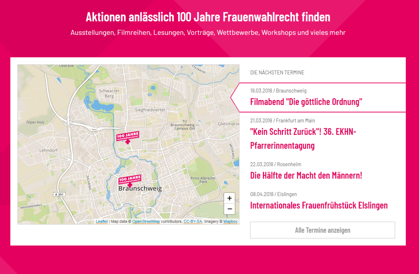 Die Computer Manufaktur hat die Veranstaltungsplattform zum Jubiläumsjahr - 100 Jahre Frauenwahlrecht und die Website "Frauen macht Politik" auf Basis von TYPO3 8.7 technisch umgesetzt. Zentrale Features sind: